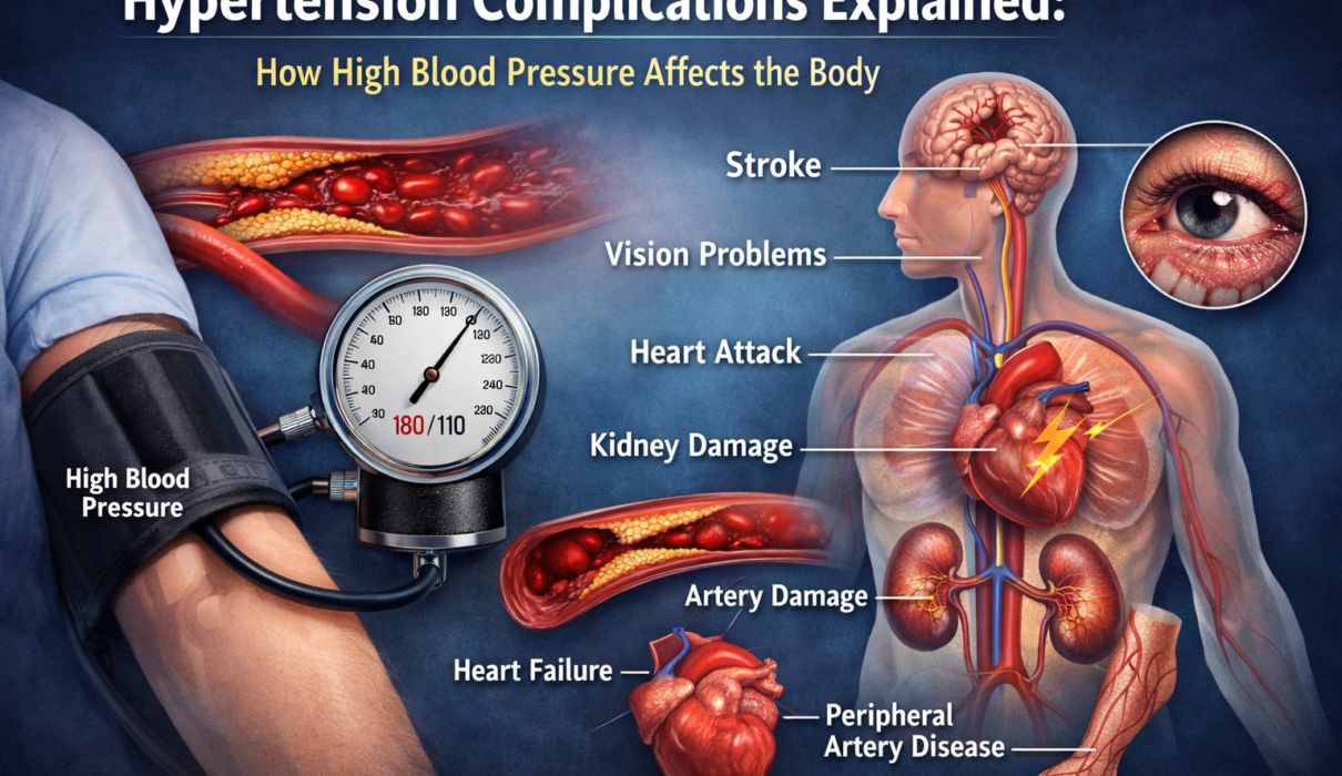 Hypertension can affect the heart, brain, kidneys, eyes, and blood vessels when left unmonitored over time. These complications develop gradually and may occur without symptoms, making routine blood pressure checks and medical evaluation essential.