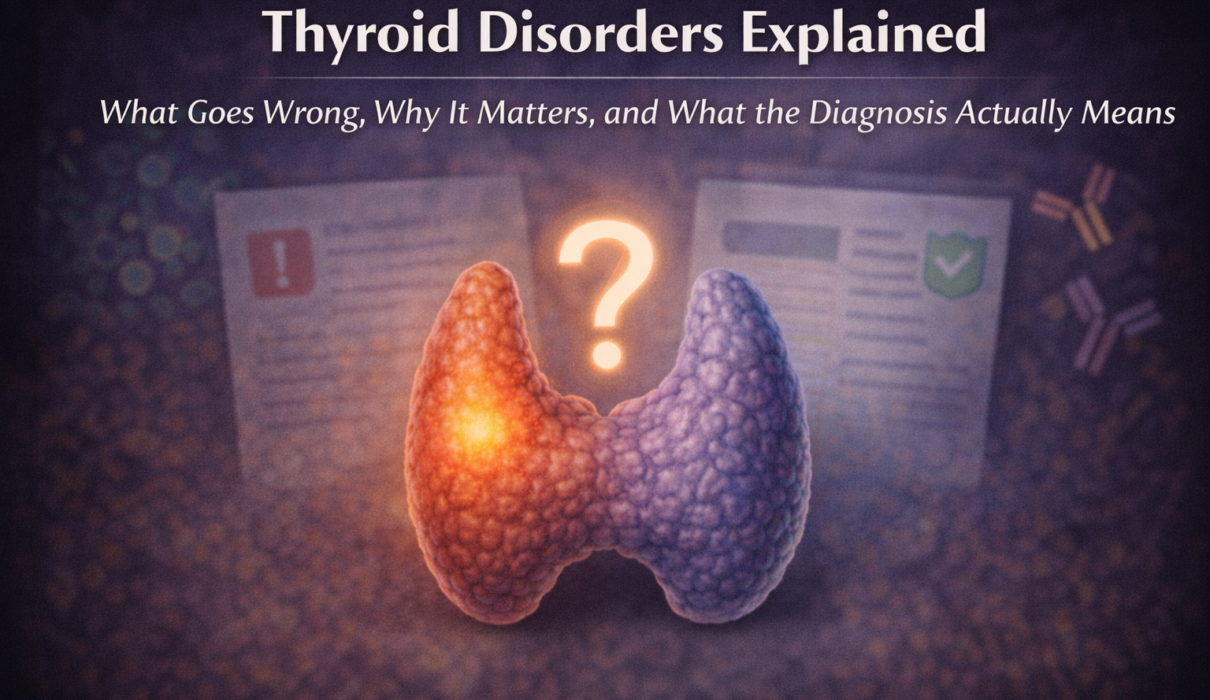 This article covers the full landscape of thyroid disorders – how the thyroid works, what the major conditions are, how each is caused, what symptoms they produce, and how they’re diagnosed.